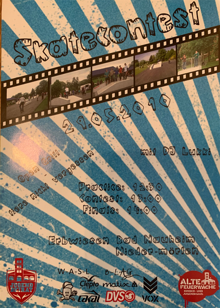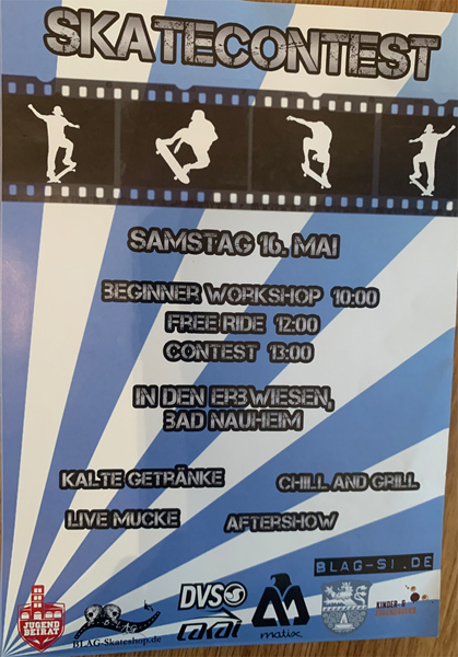17.05.2026 | Skateboard Anfänger-Workshop auf der Mini-Ramp in der Paul-Ehrlich-Straße, 35510 Butzbach (Nähe Vicus Romanus beim Basketball-Spielfeld) Kursdauer von 13:00 bis 14:00 Uhr, 5,- EUR Teilnehmerbeitrag - Es besteht Helmpflicht! Kostenlose Leihboards und einzelne Knie-, Ellenbogen- und Handgelenkschoner werden wir bereitstellen. |